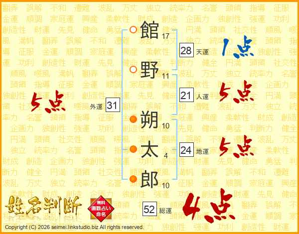 館(17画)野(11画) 朔(10画)太(4画)郎(10画)