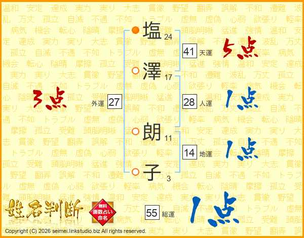 塩(24画)澤(17画) 朗(11画)子(3画)