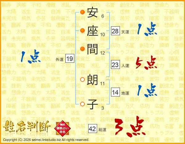安(6画)座(10画)間(12画) 朗(11画)子(3画)
