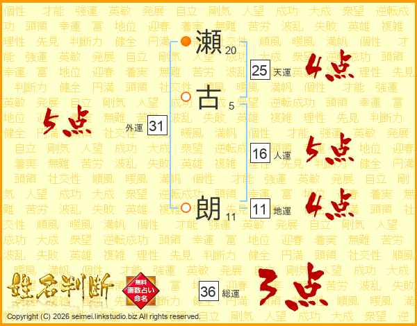 あなたの人生を表す1番重要な運勢です。生涯を通じて影響する総合運となり、主に50歳以降の晩年期に影響を及ぼします。苗字と名前の合計画数。