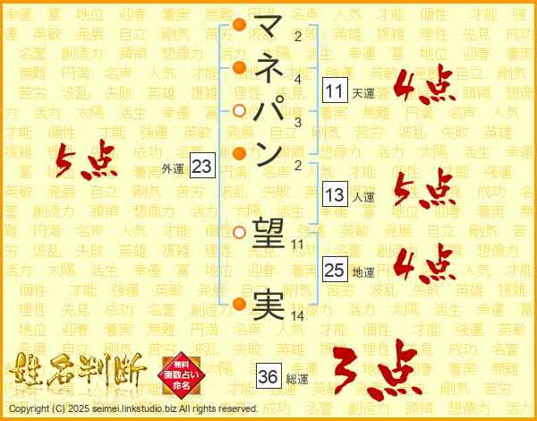 生活面を象徴する運勢です。外部から受ける影響力を表し、結婚運、家庭運や職場、環境への順応性を表します。総運から人運を引いた画数。姓や名が1文字の場合を除く。