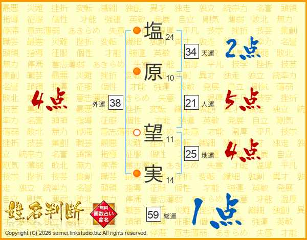 生活面を象徴する運勢です。外部から受ける影響力を表し、結婚運、家庭運や職場、環境への順応性を表します。総運から人運を引いた画数。姓や名が1文字の場合を除く。