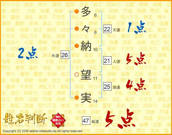 あなたの人生を表す1番重要な運勢です。生涯を通じて影響する総合運となり、主に50歳以降の晩年期に影響を及ぼします。苗字と名前の合計画数。