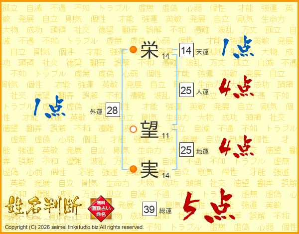 生活面を象徴する運勢です。外部から受ける影響力を表し、結婚運、家庭運や職場、環境への順応性を表します。総運から人運を引いた画数。姓や名が1文字の場合を除く。