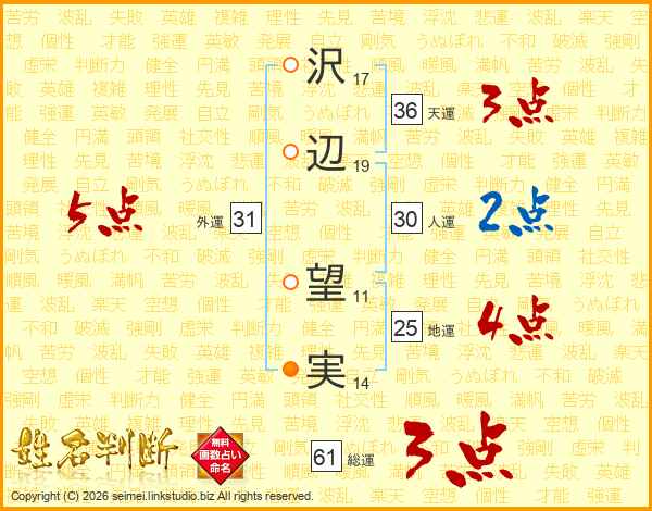沢(17画)辺(19画) 望(11画)実(14画)
