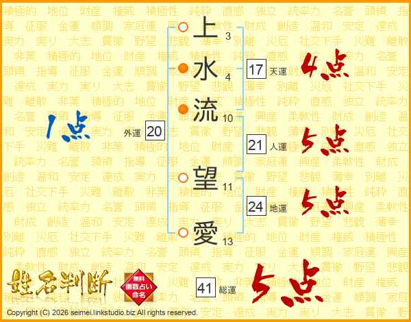 上(3画)水(4画)流(10画) 望(11画)愛(13画)