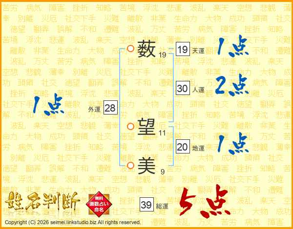 生活面を象徴する運勢です。外部から受ける影響力を表し、結婚運、家庭運や職場、環境への順応性を表します。総運から人運を引いた画数。姓や名が1文字の場合を除く。