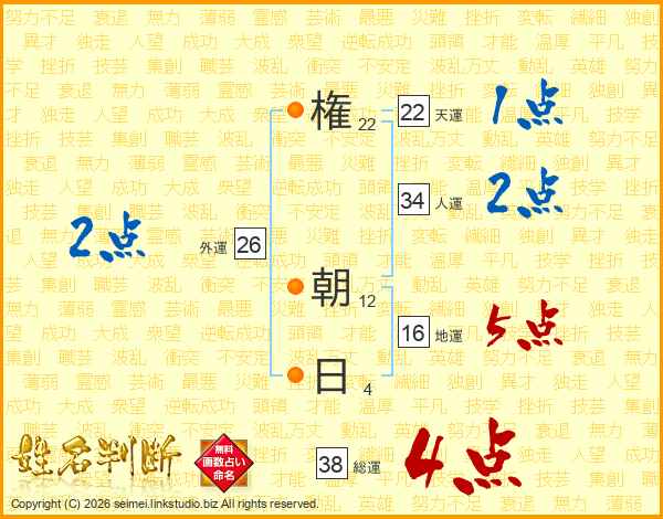 権(22画) 朝(12画)日(4画)