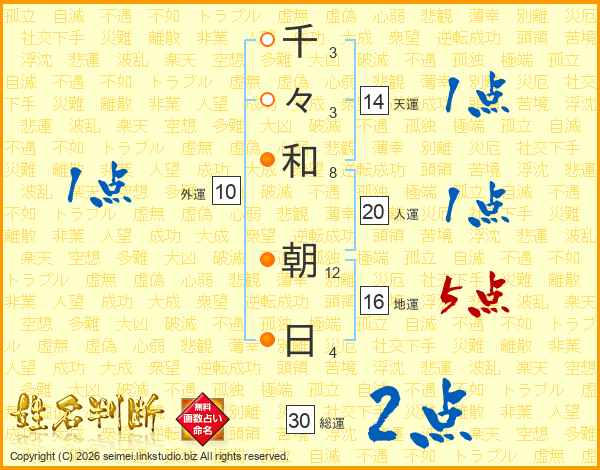 生活面を象徴する運勢です。外部から受ける影響力を表し、結婚運、家庭運や職場、環境への順応性を表します。総運から人運を引いた画数。姓や名が1文字の場合を除く。