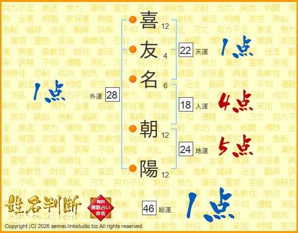 喜(12画)友(4画)名(6画) 朝(12画)陽(12画)