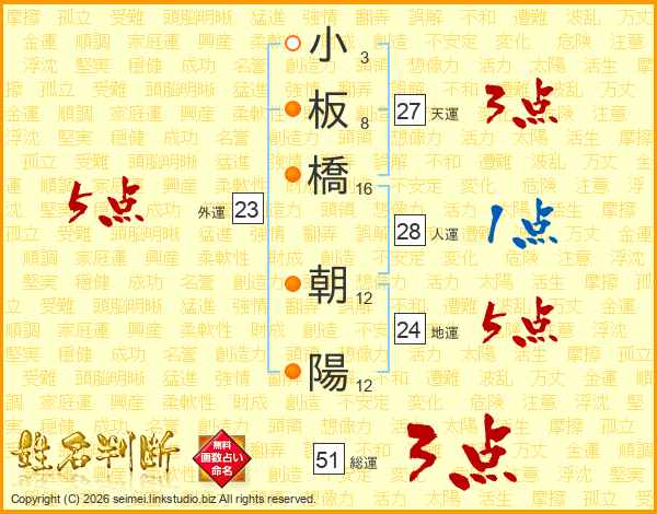 小(3画)板(8画)橋(16画) 朝(12画)陽(12画)
