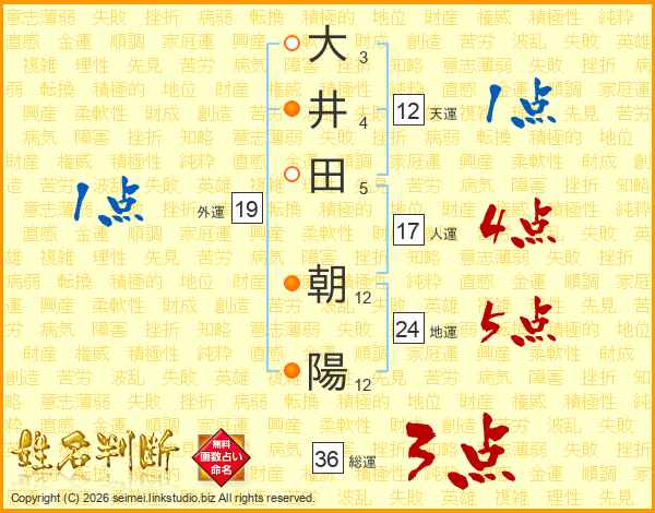 大(3画)井(4画)田(5画) 朝(12画)陽(12画)