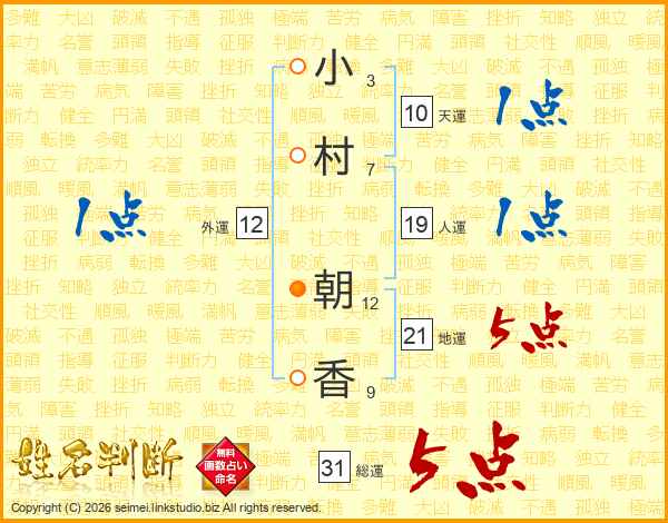 生活面を象徴する運勢です。外部から受ける影響力を表し、結婚運、家庭運や職場、環境への順応性を表します。総運から人運を引いた画数。姓や名が1文字の場合を除く。