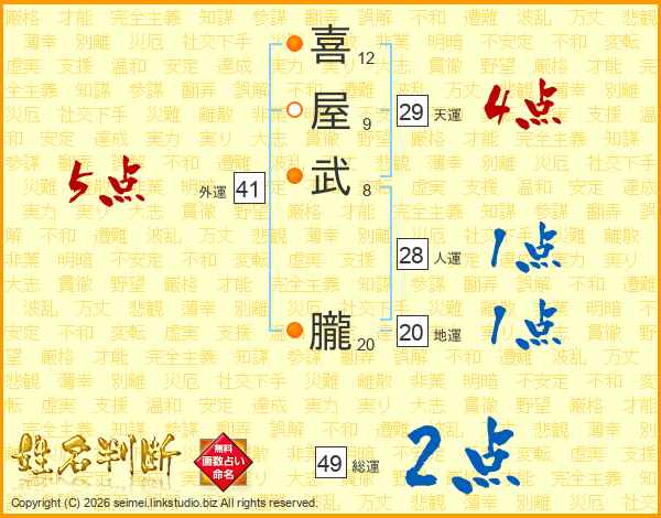 喜(12画)屋(9画)武(8画) 朧(20画)