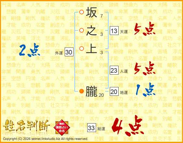 生活面を象徴する運勢です。外部から受ける影響力を表し、結婚運、家庭運や職場、環境への順応性を表します。総運から人運を引いた画数。姓や名が1文字の場合を除く。