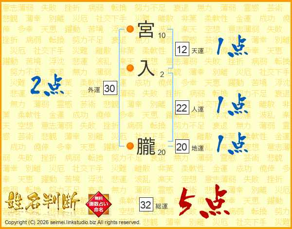 生活面を象徴する運勢です。外部から受ける影響力を表し、結婚運、家庭運や職場、環境への順応性を表します。総運から人運を引いた画数。姓や名が1文字の場合を除く。