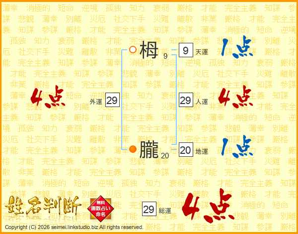 生活面を象徴する運勢です。外部から受ける影響力を表し、結婚運、家庭運や職場、環境への順応性を表します。総運から人運を引いた画数。姓や名が1文字の場合を除く。