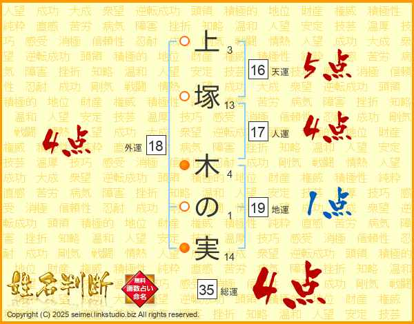 上(3画)塚(13画) 木(4画)の(1画)実(14画)