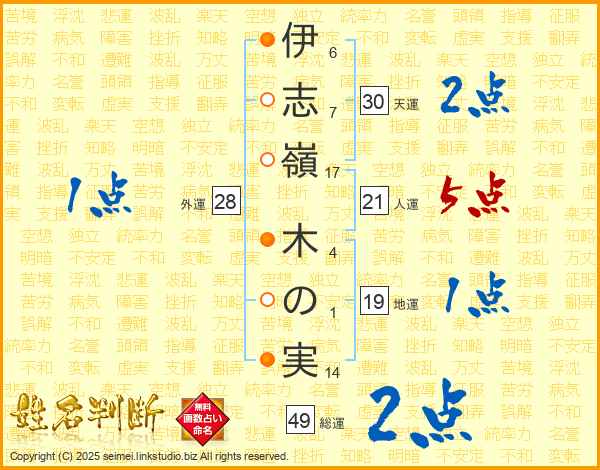 伊(6画)志(7画)嶺(17画) 木(4画)の(1画)実(14画)