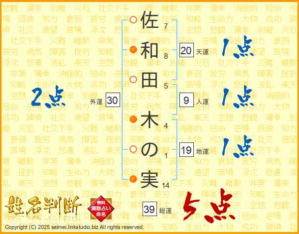 佐(7画)和(8画)田(5画) 木(4画)の(1画)実(14画)