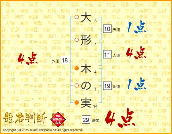 大(3画)形(7画) 木(4画)の(1画)実(14画)