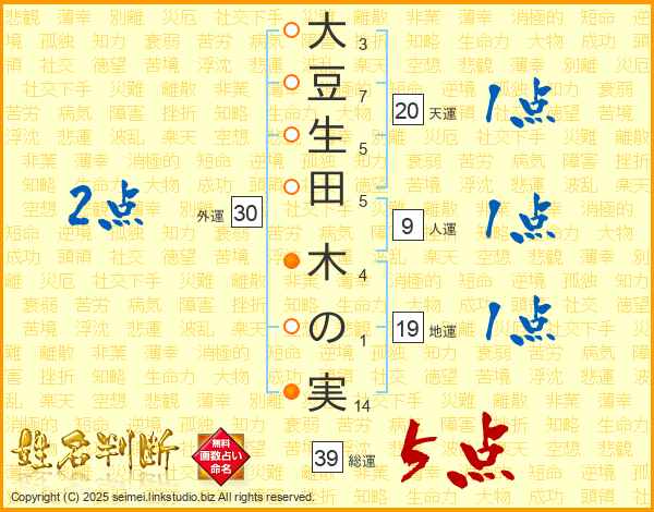 大(3画)豆(7画)生(5画)田(5画) 木(4画)の(1画)実(14画)
