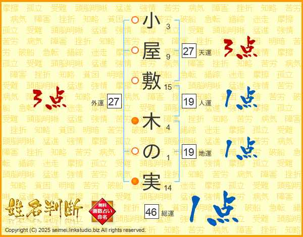 小(3画)屋(9画)敷(15画) 木(4画)の(1画)実(14画)