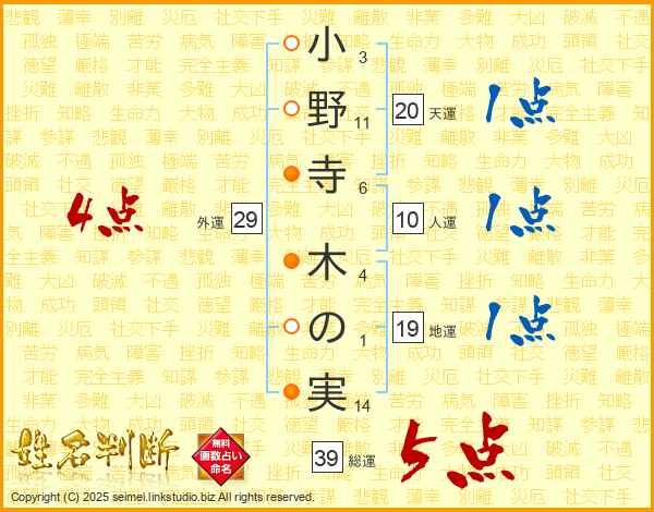生活面を象徴する運勢です。外部から受ける影響力を表し、結婚運、家庭運や職場、環境への順応性を表します。総運から人運を引いた画数。姓や名が1文字の場合を除く。
