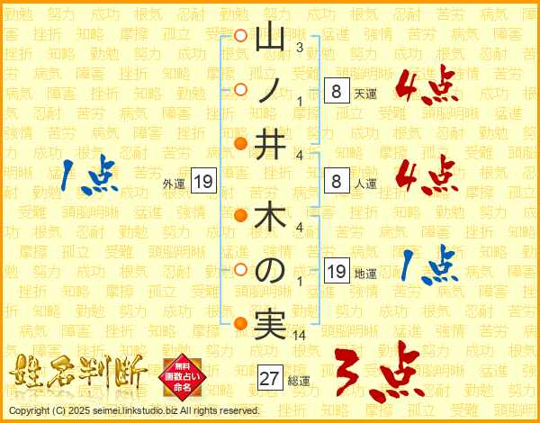 生活面を象徴する運勢です。外部から受ける影響力を表し、結婚運、家庭運や職場、環境への順応性を表します。総運から人運を引いた画数。姓や名が1文字の場合を除く。
