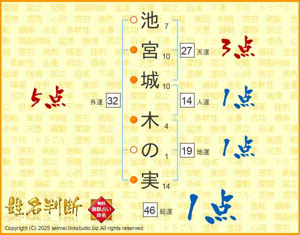 池(7画)宮(10画)城(10画) 木(4画)の(1画)実(14画)