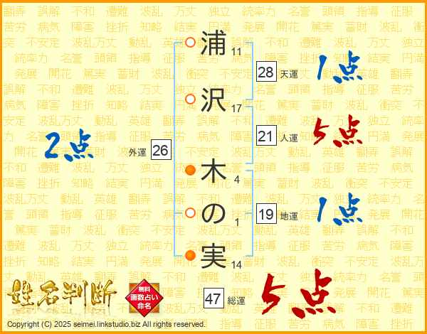 浦(11画)沢(17画) 木(4画)の(1画)実(14画)