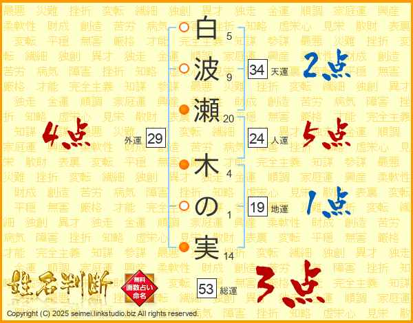 白(5画)波(9画)瀬(20画) 木(4画)の(1画)実(14画)