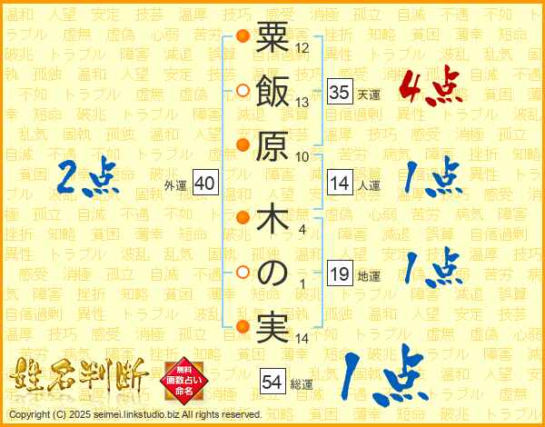 生活面を象徴する運勢です。外部から受ける影響力を表し、結婚運、家庭運や職場、環境への順応性を表します。総運から人運を引いた画数。姓や名が1文字の場合を除く。