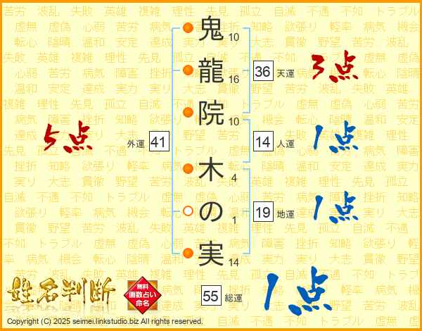 鬼(10画)龍(16画)院(10画) 木(4画)の(1画)実(14画)