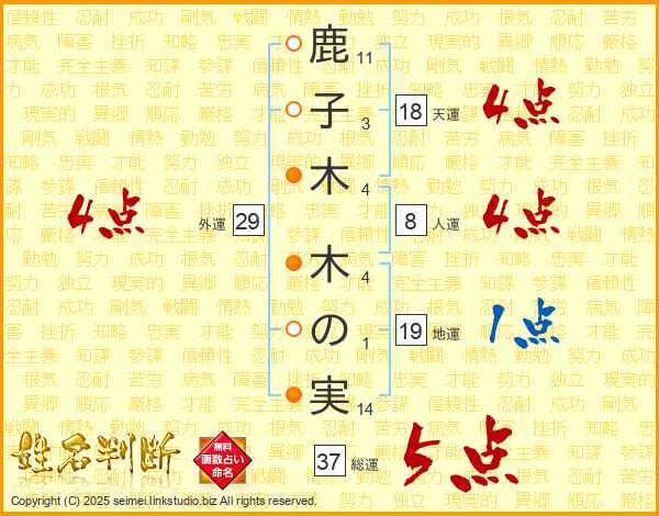 鹿子木木の実さんの総運は37画の5点!
