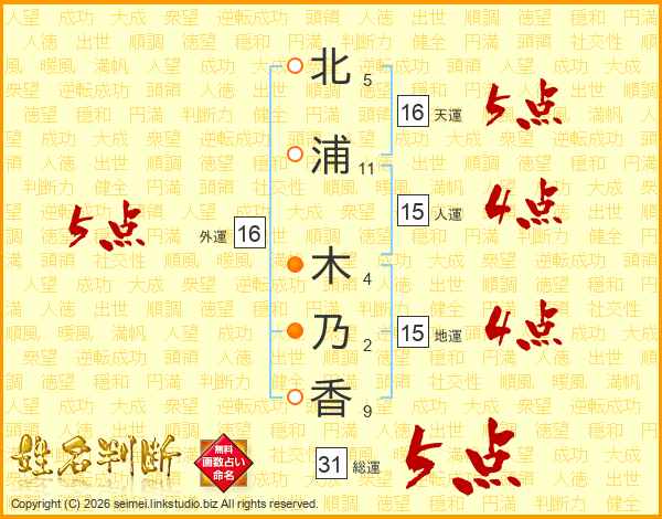 北浦木乃香さんの総運は31画の5点!