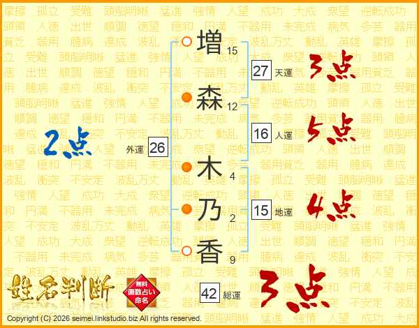 増(15画)森(12画) 木(4画)乃(2画)香(9画)