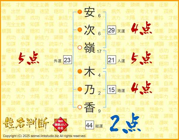 安(6画)次(6画)嶺(17画) 木(4画)乃(2画)香(9画)