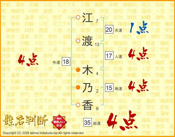 江(7画)渡(13画) 木(4画)乃(2画)香(9画)