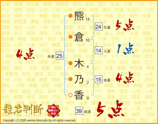 熊倉木乃香さんの総運は39画の5点!