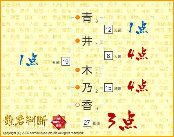 青(8画)井(4画) 木(4画)乃(2画)香(9画)