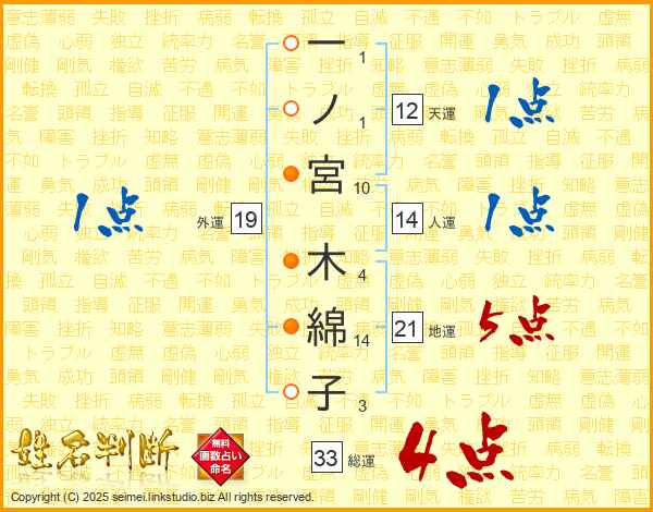 一(1画)ノ(1画)宮(10画)  木(4画)綿(14画)子(3画)