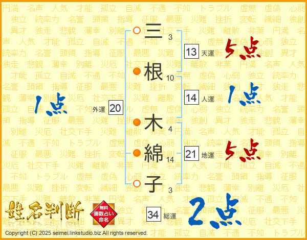 三(3画)根(10画) 木(4画)綿(14画)子(3画)