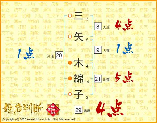 三(3画)矢(5画) 木(4画)綿(14画)子(3画)