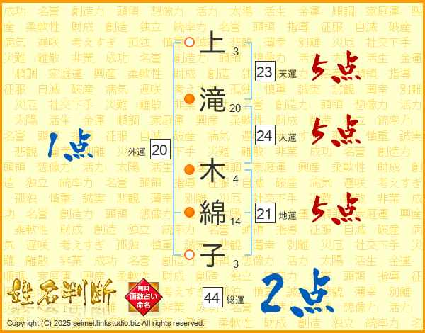 上(3画)滝(20画) 木(4画)綿(14画)子(3画)