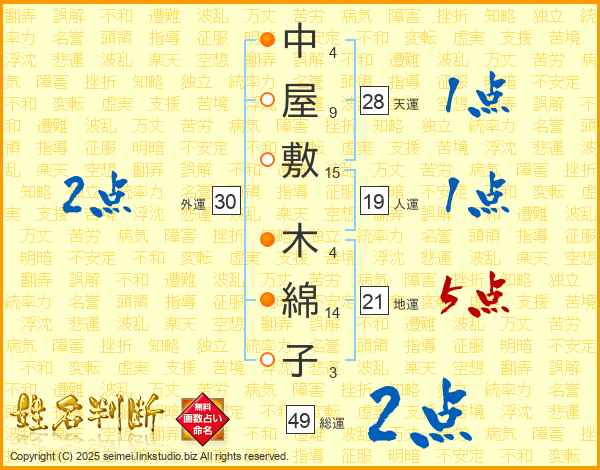 中(4画)屋(9画)敷(15画) 木(4画)綿(14画)子(3画)