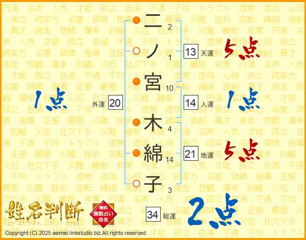 生活面を象徴する運勢です。外部から受ける影響力を表し、結婚運、家庭運や職場、環境への順応性を表します。総運から人運を引いた画数。姓や名が1文字の場合を除く。