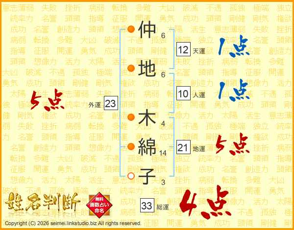 仲(6画)地(6画) 木(4画)綿(14画)子(3画)