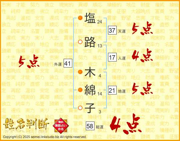 塩(24画)路(13画) 木(4画)綿(14画)子(3画)