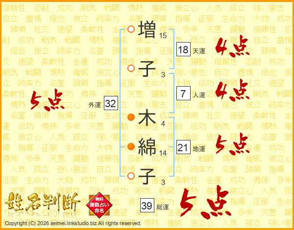 増(15画)子(3画) 木(4画)綿(14画)子(3画)